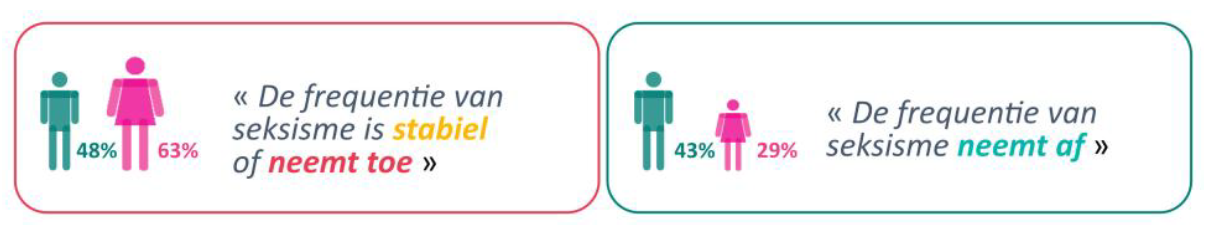 98% van de vrouwen heeft al seksisme meegemaakt en 97% van de mannen was er getuige van, maar veel meer mannen dan vrouwen denken dat het vandaag minder ernstig is dan vroeger.